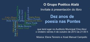 onte estiven nas pontes na presentación do libro co que o grupo alalá celebra dez anos de andaina poética. son unha xente estupenda: coñecémonos hai anos e xa compartimos moitas veladas poéticas na casa dopeso ou no alovi.